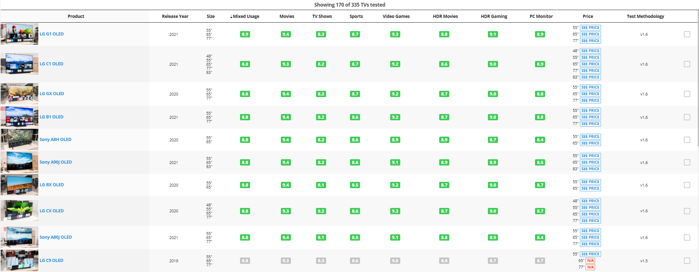 Let's check some ratings for top current TVs. According to website https://www.rtings.com/ we have next top 10 TVs series: